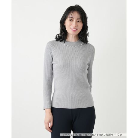 ネックラインに沿って贅沢にあしらわれたビジューが、顔周りを華やかに彩るリブニットプルオーバーです。生地には繊細なラメを織り込み、これからの季節の日差しに映える上品な光沢感をプラスしました。柔らかなリブ編みは伸縮性に優れ、身体に優しくフィットしながらも、もたつきのない快適な着心地を叶えます。やや薄手の質感はインナーとしても重宝し、日常からセレモニーまで幅広いシーンで装いを上品に格上げしてくれそうなトップスです。