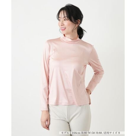 シルクを混紡した上質な素材感が魅力のハイネックカットソーです。シルク特有のなめらかな肌当たりと控えめな光沢が、日常の装いに洗練されたニュアンスを添えます。春先に心地よいやや薄手の質感ながら、優れた伸縮性を備えており、身体に優しくフィットする快適な着心地を実現しています。一枚着としてはもちろん、ジャケットやカーディガンのインナーとしても美しく映え、装いを上品に格上げしてくれる汎用性の高いトップスです。