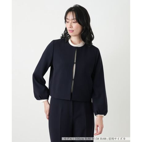 バルーン袖が印象的な、女性らしいデザインのノーカラージャケット。上品な光沢と適度なハリ感を持つ素材を使用し、ステッチを表に出さないことで、よりフェミニンで上品な仕上がりに。ショート丈は、ワンピースやワイドパンツとも好バランスです。