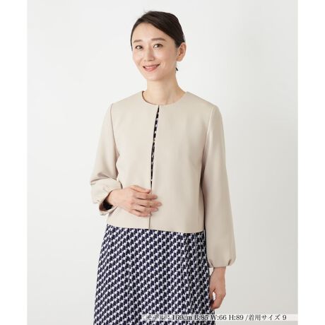 バルーン袖が印象的な、女性らしいデザインのノーカラージャケット。上品な光沢と適度なハリ感を持つ素材を使用し、ステッチを表に出さないことで、よりフェミニンで上品な仕上がりに。ショート丈は、ワンピースやワイドパンツとも好バランスです。