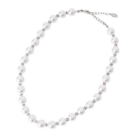 大粒のパール調ビジューの間に、煌めくガラスビジューを等間隔に配した、華やかな印象のショートネックレスです。整然と並んだパールの美しさと、ガラスの繊細な輝きが際立つ端正な仕上がりが魅力。パールの柔らかな光沢が顔周りを明るく見せ、装いに上品な品格を添えます。真ちゅう製のチェーンにはアジャスターを備えており、襟元のデザインに合わせて長さの調節も自在。セレモニーからデイリーまで、幅広いスタイルをエレガントに格上げする一品です。