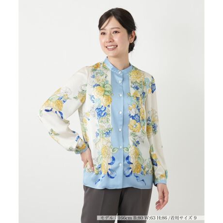 モダンなフラワー柄を巧みに切り替えたデザインが、華やかなリズムを添えるブラウスです。異なるパターンを組み合わせることで、視線を惹きつける奥行きのある表情を生み出し、一枚で着映えする洗練された佇まいに仕上げました。首元はすっきりとしたバンドカラーを採用しており、品のある女性らしいニュアンスをプラス。オフィスからプライベートなシーンまで、大人の日常をシックに彩る汎用性の高いトップスです。
