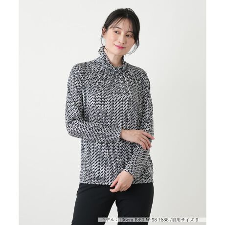 繊細かつモダンな幾何学柄が印象的なハイネックカットソーです。春先に最適なやや薄手の生地は優れた伸縮性を備えており、軽やかな肌当たりと快適なフィット感を両立しました。上品な高さのネックラインが気になるデコルテをナチュラルにカバーしつつ、首元をスマートに演出。一枚での着用はもちろん、ジャケットのインナーとして柄を覗かせるレイヤードスタイルも美しく決まる大人顔のトップスです。