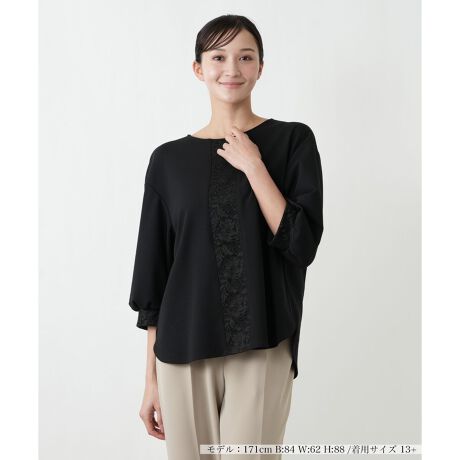 繊細なボタニカル柄のラッセルレースを、身頃と袖口にあしらった上品なブラウス。ストレッチ性のあるジョーゼット素材を使用しており、動きやすく快適な着心地です。ジャケットなしでも華やかな印象を与えるデザインは、セレモニースタイルにぴったり。同素材のスカートやパンツと合わせれば、統一感のあるエレガントな装いが完成します。