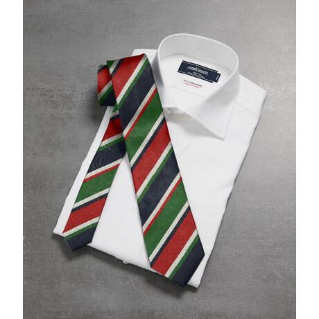 レッドを効かせたストライプデザインが目を惹く一本。2026年春夏シーズンのテーマ「ハンプトン」は避暑地としてニューヨーカーたちに人気のリゾート地。まぶしい日差しに映える海と木々の風景からインスピレーションを受けたストライプ柄です。存在感のある配色ながらも、ベースカラーを落ち着かせることで派手になりすぎず、トラッドスタイルと好相性。ブレザーやネイビースーツに合わせれば、程よく力の抜けた上品な着こなしが完成します。