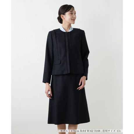 表情豊かなストレッチツイード素材で仕立てた、上品なノーカラージャケットスーツ。さりげなく織り込まれたラメ糸が、動くたびにランダムな光沢を放ち、華やかな雰囲気を演出します。ジャケットにあしらわれたフリンジが、デザインに軽やかな動きとアクセントをプラス。程よい伸縮性があり、セレモニーの席でも心地よくお召しいただけます。