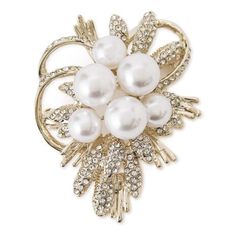 デコラティブなビジューを贅沢にあしらった、気品あふれるブローチです。中央に集めたパール調ビジューの柔らかな光沢と、周囲を彩るガラスの繊細な輝きが相まって、胸元に華やかな存在感を放ちます。台座には真ちゅうを使用しており、細部まで丁寧に作り込まれたエレガントなデザインが魅力。入学式や卒業式などのセレモニーシーンから、日常のジャケットスタイルのアクセントまで幅広く活躍し、装いを上品に格上げしてくれる一品です。