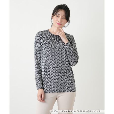 繊細かつモダンな幾何学柄を配したクルーネックカットソー。春らしい薄手で軽やかな素材感に加え、伸縮性に優れた生地を採用することで、動きやすくストレスフリーな着心地を実現しています。首元はすっきりと仕上げ、バックネックの涙あきには着脱をスムーズにするボタンを配して実用性も兼ね備えました。一枚でコーディネートの主役になるのはもちろん、ジャケットのインナーとしても映え、大人の日常着を上品に彩るトップスです。