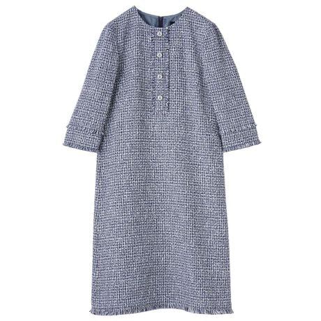 4種の糸と小羽根糸が織りなす、奥行きのあるファンシーツイードのワンピースです。素材の持つ豊かな陰影を活かすため、シルエットは端正に。随所にあしらったフリンジが、動きに合わせて柔らかな表情を添えます。