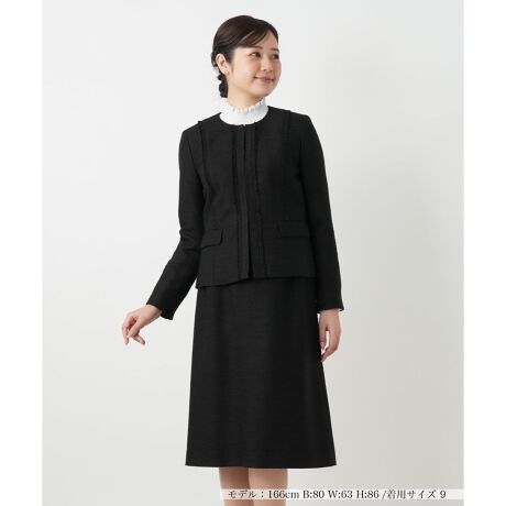タテヨコの糸使いで表情豊かに織り上げたストレッチツイードを使用。ランダムに光るラメ糸と部分的なフリンジ使いが、セレモニーシーンに相応しい格調高い華やかさを演出します。エレガントなセミタイトスカートで、着るたびに自信が持てる一着です。