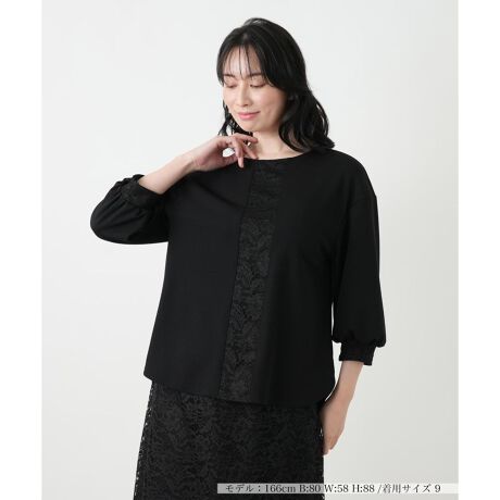 ストレッチ性のあるジョーゼット素材に、前身頃と袖口の繊細なラッセルレースを重ねた華やかなデザイン。同素材のスカートと合わせてセットアップとしても、また他の単品ボトムを合わせても洗練されたフォーマルスタイルが完成します。
