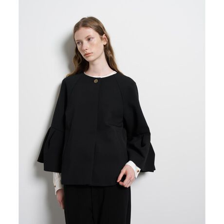 タックのパターンにこだわり、深く角度をつけたことで立体的に仕上げています。デザイン性のある袖でも、短めにすることで抜け感と軽やかさを演出。身頃はすっきりとしたやや広がりのあるシルエットに。ジャンヌランバンのイニシャルJLをかたどったボタンがアクセントとなり、顔周りに華やかさを添えています。