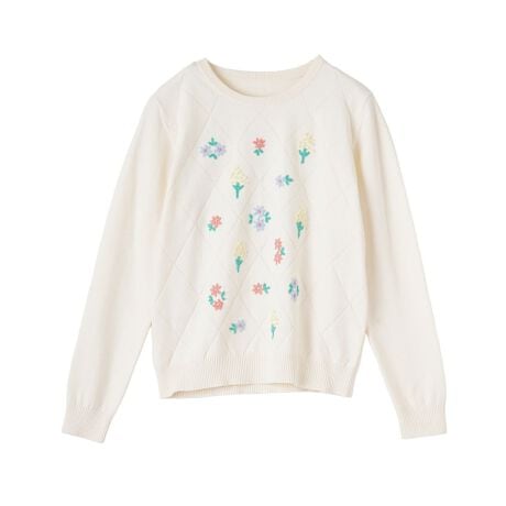 アーガイル調の編地に可憐なフラワー刺繍を散りばめた、表情豊かなニットプルオーバーです。コットンに少量の毛をブレンドした素材を使用し、春先にふさわしい軽やかさと柔らかな肌当たりを両立しました。伝統的な柄に刺繍の華やかさを加えたデザインは、一枚でコーディネートの主役になれる存在感が魅力。やや薄手の質感で伸縮性にも優れており、季節の変わり目に重宝する心地よいフィット感に仕上げています。