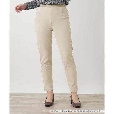 レッグラインを美しく引き立てる、ストレッチ性に優れたスリムパンツ。春の外出に嬉しいUVカット機能と速乾性を備えたやや薄手の生地を採用し、日差しが気になる季節もさらりと快適な着心地をキープします。ウエストは全周ゴム仕様で、ラメを混紡した華やかなベルトが装いの洗練されたアクセントに。ポケットを排したすっきりとしたミニマルなフォルムが、大人のデイリースタイルをスマートかつ上品に格上げする一本です。