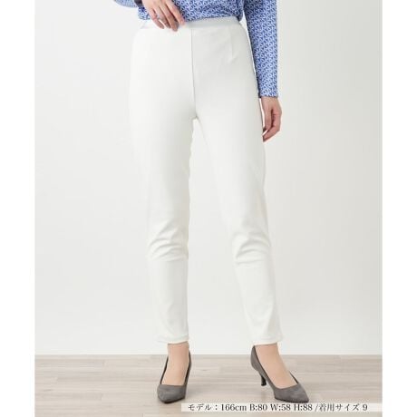 レッグラインを美しく引き立てる、ストレッチ性に優れたスリムパンツ。春の外出に嬉しいUVカット機能と速乾性を備えたやや薄手の生地を採用し、日差しが気になる季節もさらりと快適な着心地をキープします。ウエストは全周ゴム仕様で、ラメを混紡した華やかなベルトが装いの洗練されたアクセントに。ポケットを排したすっきりとしたミニマルなフォルムが、大人のデイリースタイルをスマートかつ上品に格上げする一本です。