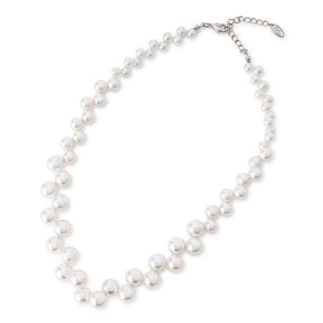 大小さまざまなパール調ビジューをバランスよく交互に連ねた、胸元を華やかに彩るショートネックレスです。ナチュラルかつ柔らかな光沢が顔周りを明るく見せ、セレモニーシーンから大人のデイリースタイルまで幅広く活躍。真ちゅう製のチェーンにはアジャスターを備えており、襟元のデザインに合わせて長さの微調整が可能です。ボリューム感のあるデザインが、シンプルな装いも一気に洗練されたエレガントな印象へと引き立てるアクセサリーです。