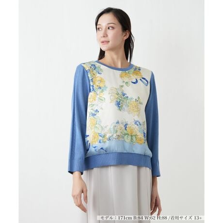 華やかなプリント生地と、着心地の良いニット素材を組み合わせたコンビネーションプルオーバー。前身頃に美しいフラワープリントをあしらい、アクセサリーなしでも顔周りがぱっと明るくなるデザインです。袖と後ろ身頃は伸縮性のあるニットで仕立て、快適な着用感を実現。袖山のケーブル編みが縦のラインを演出し、腕をすっきりと見せてくれます。