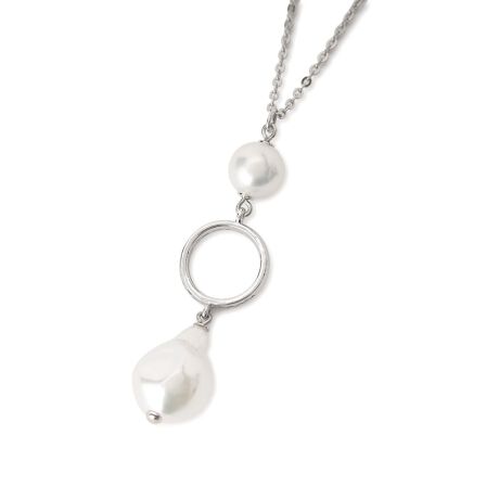 繊細なチェーンに、大きさの異なる丸いパール調モチーフと、雫のようなドロップ型パール調モチーフが配されており、首元にエレガントな華やぎを添えます。シルバーカラーのリングが加わることで、モダンな雰囲気が加わり、装いに奥行きをもたらします。長さ調節が可能なアジャスター付きのため、装いのネックラインに合わせて様々なスタイリングをお楽しみいただけます。動くたびにしなやかに揺れるデザインが、デコルテラインを美しく引き立て、洗練された印象を与えます。