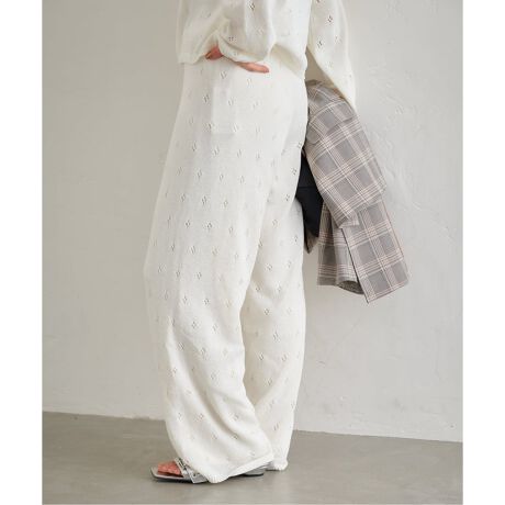 ・小さなお花のようなクロシェ柄の編地を使用した、表情のあるニットパンツ