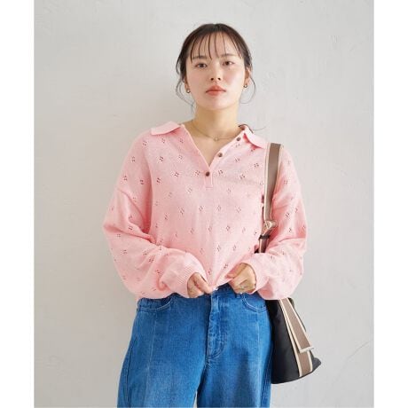 ・小さいお花のようなクロシェ柄の編地で仕立てたニットプルオーバー