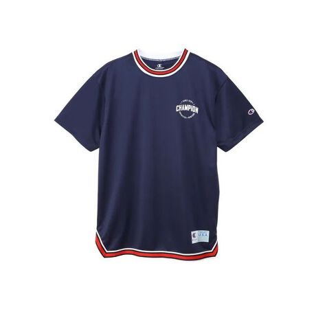 左胸にアメリカのバスケットボールシーンなどで見られるエンブレムをイメージしたグラフィックをラバープリントで入れ、襟にはラインリブ、裾にはラインテープを使用しています。