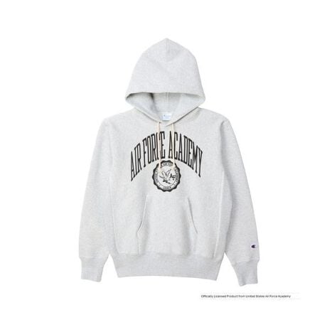 Champion?(チャンピオン)のスウェットシャツは、「ザ キング オブ スウェットシャツ」と評されるほど、世界中の多くのファンに愛されてきました。チャンピオンを代表する製法の「REVERSE WEAVE?(リバースウィーブ?)」。洗うほどにタフになり、着こむほどに独特の風合いや味が出る裏起毛素材を使用した「REVERSE WEAVE? 11.5oz. Terry Fleece(リバースウィーブ? 11.5オンス テリーフリース)」シリーズのフーデッドスウェットシャツです。コットン素材は環境に配慮して生産されたサステナブルなアメリカ綿を100%使用。本来は縦方向に使われる生地を横方向に使用する「REVERSE WEAVE?」製法によって縦の生地の縮みを防ぐと同時に、両脇に「EXPANSION GUSSET(エクスパンションガゼット)」を付けることで横の縮みへの影響を少なくし、動きやすさに配慮しています。胸のグラフィックはアメリカ合衆国の空軍士官学校(United States Air Force Academy)をモチーフにしたもので、「AIR FORCE ACADEMY(エア フォース アカデミー)」と校章を組み合わせた単色プリントと、ストレート状の3段組にレイアウトした「AIR FORCE ACADEMY」とカプセルを組み合わせた2色プリントの2種類。シルバーグレーとブラックの2色を使ったボディには染み込みプリント、シルバーグレーとネイビーの2色を使ったボディ、ダークネイビー、ブラックのボディにはラバープリントを使用しています。ネームタグは1970年代モデルの「青単タグ」(青単色タグ)を採用。アメリカの空軍士官学校は、士官候補生が正規士官として勤務するために必要な能力やリーダーシップ、知識を育成する4年制の学校。卒業生は理学士(Bachelor of Science)の学位を取得し、空軍少尉もしくは宇宙軍少尉に任官します。