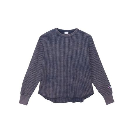 環境に配慮して生産されたサステナブルなアメリカ綿とリサイクルポリエステルを使用したロングスリーブシャツです。凹凸感のあるワッフル素材による優しい肌触りが特長です。身幅、肩幅に大きくゆとりを持たせたルーズフィット。裾はおしゃれにタックアウトできるラウンドヘムカットにし、シンプルなデザインの中にアクセントを加えています。ユーズド感を演出する加工による柔らかな風合いやアタリ感、色落ちなどのヴィンテージテイストが魅力です。同素材を使用したスカート(CW-C204)も展開しているので、セットアップでの着用もオススメです。