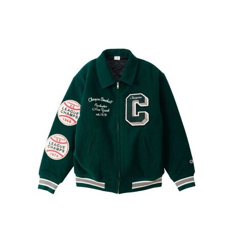 196070年代のアメリカのベースボールをファッションやデザインとして取り入れた、懐かしさとクラシックな雰囲気が特徴的な「RETRO BASEBALL(レトロ ベースボール)」をテーマとするコンセプトパッケージのラインナップ。ウールとポリエステルの混紡糸を使用したヘビーウェイトなメルトン素材のアワードジャケットです。「アワードジャケット」とはもともと野球選手がベンチで着る防寒着として作られたもの。後に大会などで活躍した選手に記念(アワード)として贈られるようになったことからその名が付いたと言われています。裏地に中綿(60g)を入れたダイヤモンドキルト生地を使用。左胸には大きなChampion?(チャンピオン)の「C」をフェルトと太い刺繍糸を組み合わせた立体感のあるシニールワッペンを付け、右胸には「CHAMPION BASEBALL」、チャンピオンブランド誕生の地「Rochester New York(ニューヨーク州ロチェスター市)」、ブランド創設年「1919」などを組み合わせたチェーン刺繍をしています。さらに背中にはチェーンステッチ刺繍による「ROCHESTER」とニューヨーク州の動物として正式指定されている「ビーバー」をマスコットキャラクター風にデザインしたシニールワッペンを、右袖には野球のボールをベースにしたチャンピオンエンブレム風シニールパッチを付けています。前立てはジップ式で、前身頃の両サイドには玉縁ポケット、左胸の内側には内ポケットを付けています。袖口、裾はラインリブ仕様。薄手の生成りコットンを使ったクラシックな印象のネームタグは、コンセプトパッケージだけの限定バージョンです。