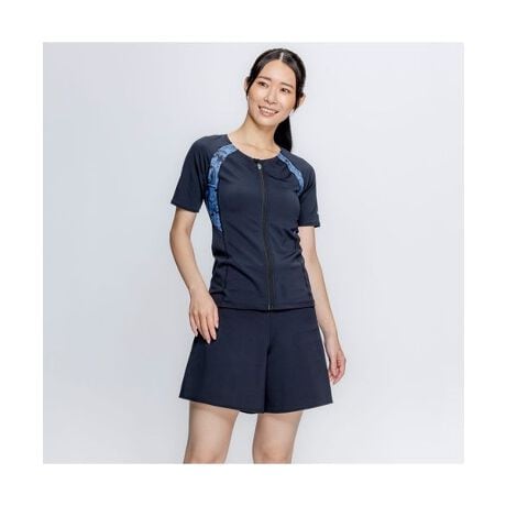 動きやすさもおしゃれも叶える体型カバー、気になる下半身を美しくカバーするフレアフィットショーツのフィットネス水着。袖が腕まわりをスッキリ見せるトップスは、ジッパー付きで着脱簡単。めくれ防止のスナップボタンでトップスとボトムスが留められる仕様。ブラカップ付属。ボトムスは裏地付き、股下13cm(Mサイズ)。