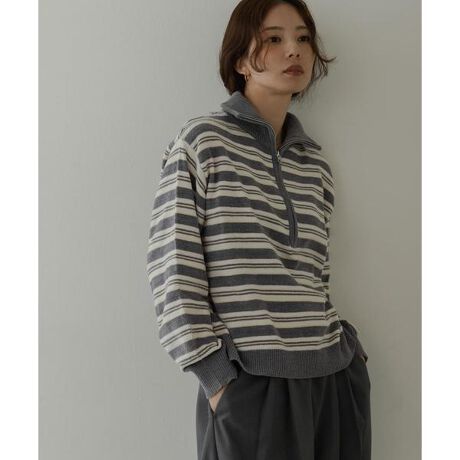 トレンド感のあるハーフジップとマルチボーダーの編み地が着映えするプルオーバー