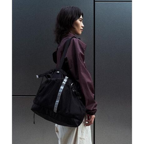 外側の大型メッシュポケットは、細かな仕切りをあえて作らないことで軽アウターの収納も可能で、コードを締めることで細かなアイテムも安心して格納できる汎用性の高い仕様になっています。また、アクティブなシーンでの使用には、付属のショルダーストラップをつければななめがけも可能に。底部分にはナイロン210デニールの高強度リップストップ生地を使用。ポリウレタン(PU)コーティングを施した耐久性のある素材で、強度、耐摩耗性、耐引裂性を示します。幅広いシーンで活躍してくれるシンプルなアイテム。