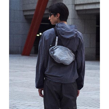 軽量で、引き裂き強度が高く、撥水性も兼ね備えた米AVIENT社のDyneemaを外ポケットに使用。その機能性はもちろんのこと、中身が透ける独特の素材感が魅力です。2.6Lのコンパクトなサイズ感でありながらも背面には内部に鍵などを取り付けられるキーリングもついている小物用ポケットを配置しているので、安全性を担保しつつ取り出し易い仕様となっています。生地の撥水性に加え、止水ファスナーを使っているので突然の雨でも内容物を守ります。主にデイリーユースとして、ちょっとした買い物時に便利なアイテムです。ストラップのバックルにはV字アジャスターパーツを使い、通常のサイドリリースバックルよりも着脱し易い仕様になっています。 生地の切り替えによって、アシンメトリーで独創的なデザインを採用。