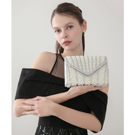 全面に敷き詰められた大小のパールと、煌めくビジューのラインが織りなすラグジュアリーなパーティーバッグ。