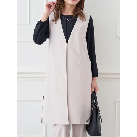 Vネックのデザインですっきりとした着こなしを楽しめるロングジレジャケット。