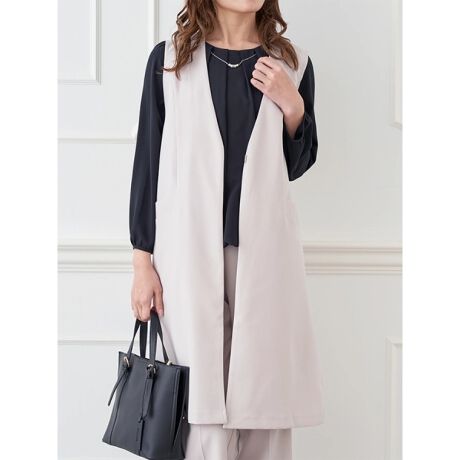 Vネックのデザインですっきりとした着こなしを楽しめるロングジレジャケット。