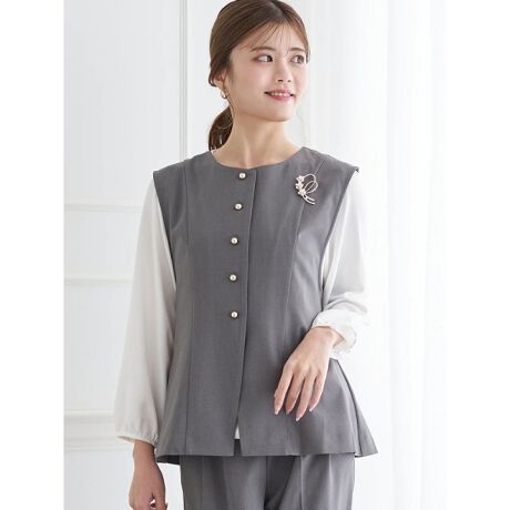 かっちり見えするツイル素材を使用した、きれいめ印象のノーカラーベスト。