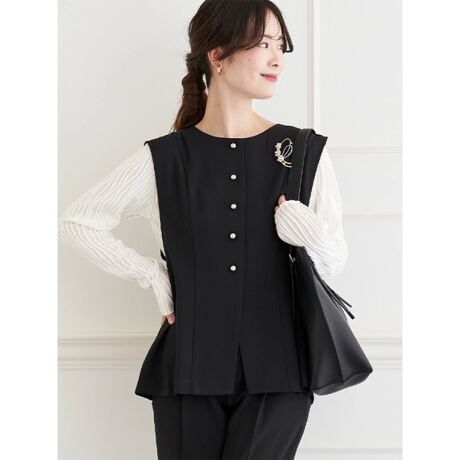 かっちり見えするツイル素材を使用した、きれいめ印象のノーカラーベスト。