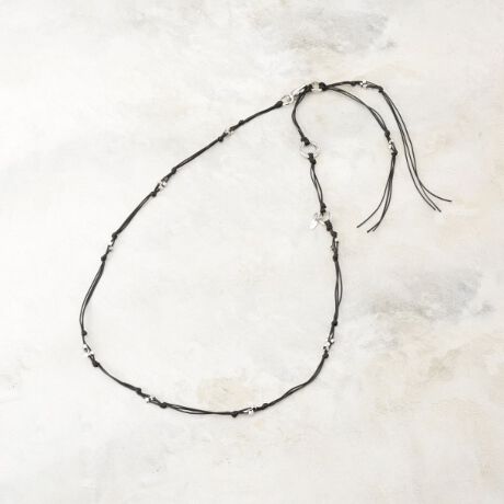 しなやかなコードに、等間隔でメタルビーズと結び目をあしらった、クラフト感のあるデザインが特徴。