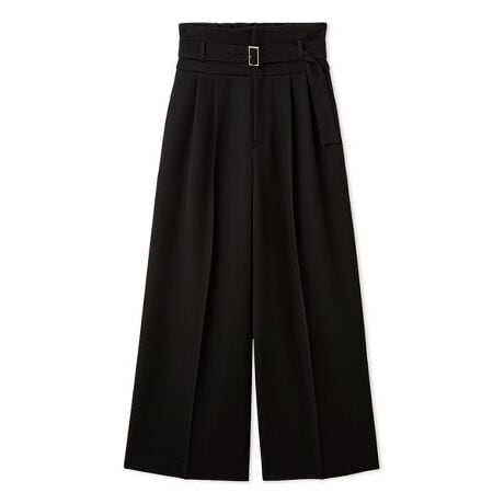 きれいめなワイドスラックスに、スーパーハイウエストでモードなひねりを加えた1枚。