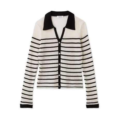 リブカーディガンに、スキッパーポロカラーでトレンド感をさりげなく添えて。