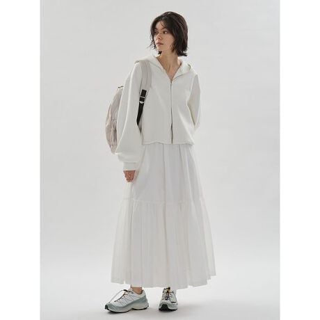 少しシャリみのある素材のスカートなので、スウェットやTシャツなどのカジュアルな素材のトップスとの相性抜群です。