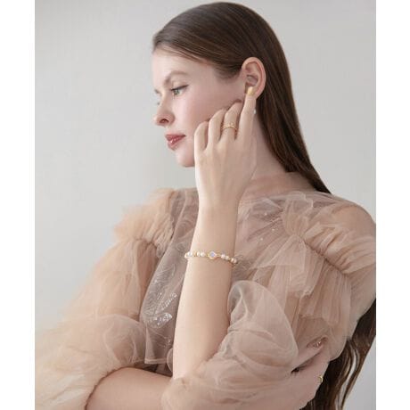 ゴールドパーツの繊細な煌めきが手元を華奢に、そして美しく魅せ、どの角度から見てもクラス感のある佇まいを演出します。計算された絶妙なボリューム感は、ハレの日のスタイリングに豊かな表情と輝きをプラスする特別な一品。