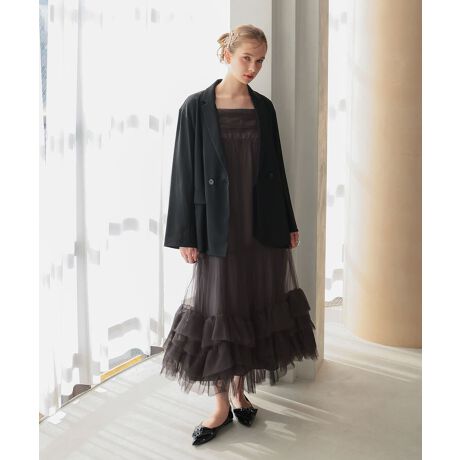 裾にたっぷりフリルをあしらったチュール素材のキャミワンピースと、ジャケットを組み合わせたセットアイテム。