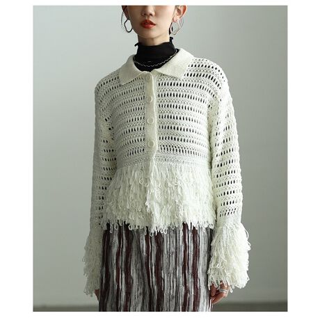 メッシュ素材にフリンジを効かせた、存在感のあるカーディガン。裾のフリンジが動くたびに表情をプラスし、羽織るだけで今っぽい雰囲気に。トレンド感をさりげなく取り入れられる一枚です!