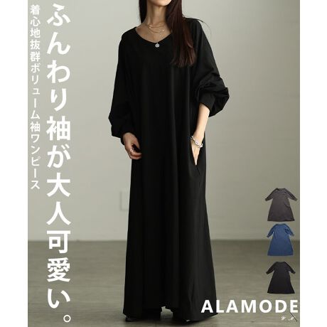 【ワンピース】 ブラック 黒 ネイビー 紺 チャコール ロング 長袖 パフスリーブ フレア コットン