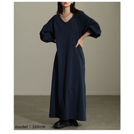 タック入りで立体感のあるボリューム袖が目を惹くVネックワンピース。顔まわりをすっきり見せてくれるVネックに、ロング丈×ゆったり身幅でストレスフリーな着心地。ラフなのにこなれた雰囲気が自然と生まれる一枚です☆