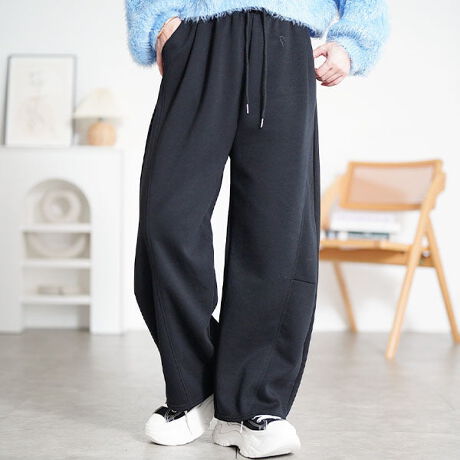 立体感のあるバレルシルエットが特徴のワイドパンツ。わたり幅にゆとりを持たせ、立体感のある丸みシルエットが特徴。総ゴム仕様のウエストにドローコードをプラスして、ウエストにしっかりフィット。股上は深め設計でお腹まわりまで包み込む安心感あり☆柔らかさと伸縮性を兼ね備えたスウェット生地で、オールシーズン活躍。デイリー使いからルーム使いまで、カジュアルなシーンにぴったり。毎日のコーデに自然と馴染む大人カジュアルなトレンドボトムスはおすすめのアイテム。