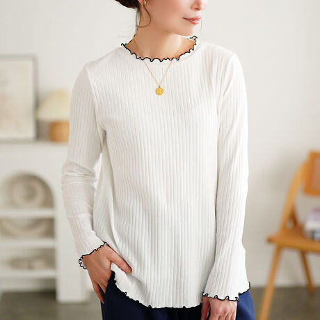 首元や、袖口、裾にあしらわれた配色のメロウデザインが、シンプルなカットソーに甘さをプラスしてくれる一着。ベーシックなデザインだから、あらゆるシーンに溶け込み、一枚でもレイヤードスタイルにも着こなしやすく、綺麗めに仕上げてくれます。リブ仕立ての生地だから、着るだけで縦ラインを強調し、コンパクトなシルエットと相まってすっきり見えに。首元は2cm丈のプチハイネックでカジュアルながら、きちんと見えをプラス。インもアウトもサマ見えする絶妙丈で、スタイリングの幅も広がります。