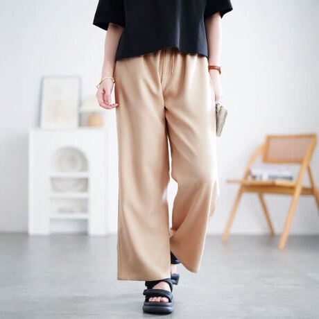 大人の抜け感漂う綺麗めシルエットのワイドパンツの登場です!程よいワイド感とすっきりラインの絶妙バランスでヘビロテ間違いなし☆調節紐付き総ゴム&深めの股上でストレスフリーな穿き心地◎トップスを選ばず着こなせるシンプルデザインで旬スタイルが楽しめます♪穿くだけでこなれ感の効いたワンランク上のコーデに!幅広い年齢の方にもオススメのパンツです☆