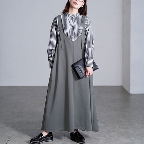 レイヤードスタイルを盛り上げるジャンパースカートは、四季を通して楽しめる一着。シンプルだからこそ、インナーやアウターを選ばず、重ねるだけで大人の垢抜けカジュアルに。カジュアルにも綺麗めにも着こなせる、高見え感のあるテクスチャーで大人っぽさを演出します。落ち感のあるAラインシルエットでボディラインを拾わず、重ねるだけで気になるお腹や、ヒップ、下半身を体型カバー。肩紐はアジャスター仕様だから気分やシーンに合わせてお好みの丈感に調節可能。深めのVネックで顔周りすっきり。厚手のインナーでも窮屈感を感じません。
